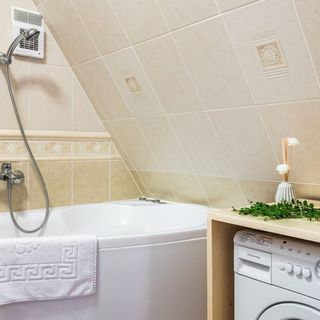 Wanna z prysznicem, WC, umywalka, lustro, ręczniki, suszarka do włosów, pralka