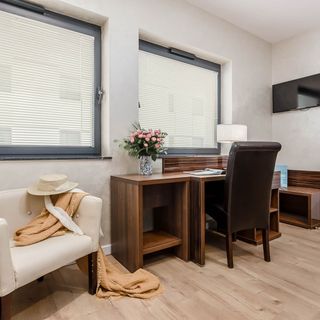 Dwa wygodne, pojedyncze łóżka stanowią najważniejsze miejsce w apartamencie. Poranną kawę można wypić w pokoju - wśród udogodnień znalazł się czajnik i zestaw do parzenia kawy i herbaty. Pokój wyposażony jest także w małą lodówkę. Pojemne szafki pozwolą zmieścić wszystkie bagaże, a małe biurko stanowić będzie świetne miejsce do pracy. Pokój posiada własną łazienkę z prysznicem. Zapewniamy także niezbędne kosmetyki, świeże ręczniki i suszarkę do włosów.