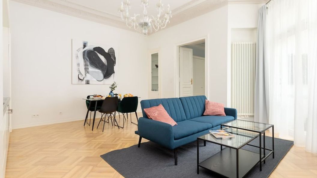 Przestronny apartament przeznaczony dla 5 osób będzie idealną bazą wypadową na zwiedzanie najważniejszych zabytków Warszawy. Salon został połączony z częścią jadalnianą i aneksem kuchennym. Znajduje się tutaj niezwykle wygodna, granatowa sofa, która po rozłożeniu będzie stanowić miejsce do spania dla jednej osoby. Przy sofie umieszczono szklany stolik kawowy, dzięki czemu relaks przed TV z kubkiem kawy będzie czystą przyjemnością. Do apartamentu przynależy balkon, wychodzący na wewnętrzny dziedziniec oraz wyposażony w meble ogrodowe. Za sofą znajduje się stół jadalniany dla czterech osób. To świetne miejsce, by spędzić wspólnie czas w trakcie posiłków przygotowanych we własnym zakresie w świetnie wyposażonym aneksie kuchennym. Skoro o nim mowa – znajdują się tutaj wszelkie niezbędne przybory i sprzęty takie jak: płyta kuchenna, piekarnik, zmywarka, lodówka z zamrażarką, mikrofalówka, a także czajnik wraz z zestawem do parzenia kawy i herbaty. Apartament posiada dwie, prywatne sypialnie - obie wyposażone w dwuosobowe łóżka. W jednej z nich znajduje się bardzo pojemna szafa oraz lustro, natomiast w drugiej znajdziecie dodatkowo biurko. Jasna łazienka w kamienicznym stylu wyposażona jest w ogromny prysznic typu walk-in oraz wannę na ozdobnych nogach, dzięki czemu amatorzy szybkich pryszniców oraz miłośnicy długich kąpieli będą zadowoleni. Dodatkowo znajduje się tutaj osobna toaleta, gdzie znajduje się także pralka. Aby ułatwić rozpoczęcie każdego pobytu, na gości czeka bezpłatny zestaw kosmetyków, ręczniki i pościel.