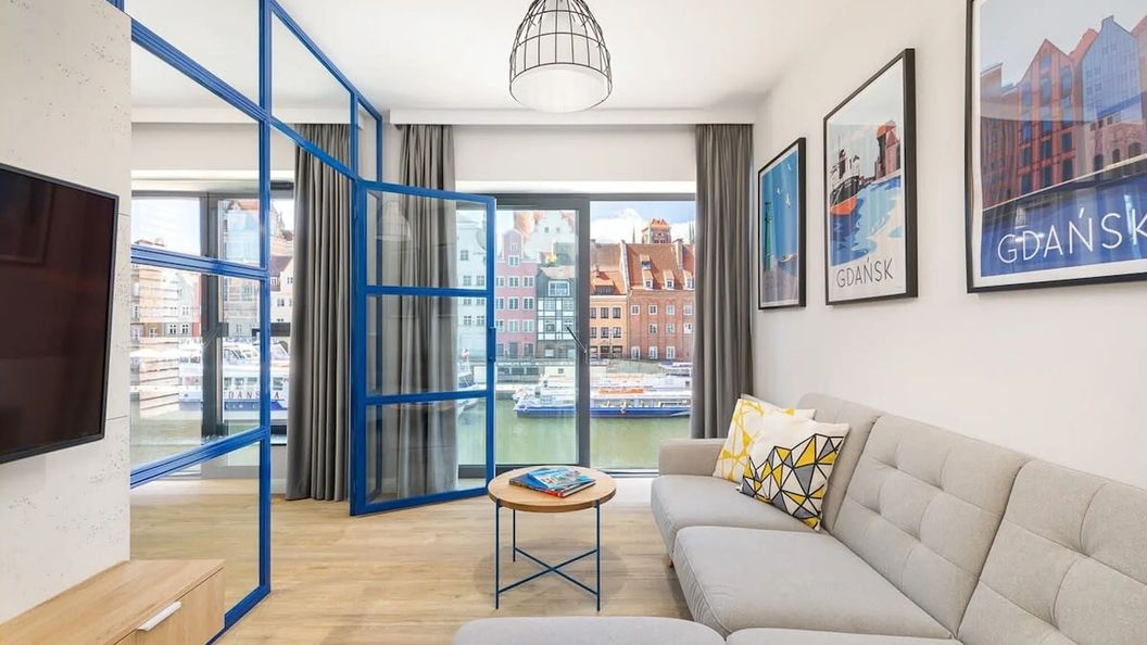 Podwójne łóżko, TV, zapierający dech w piersiach widok na Motławę