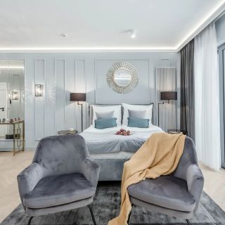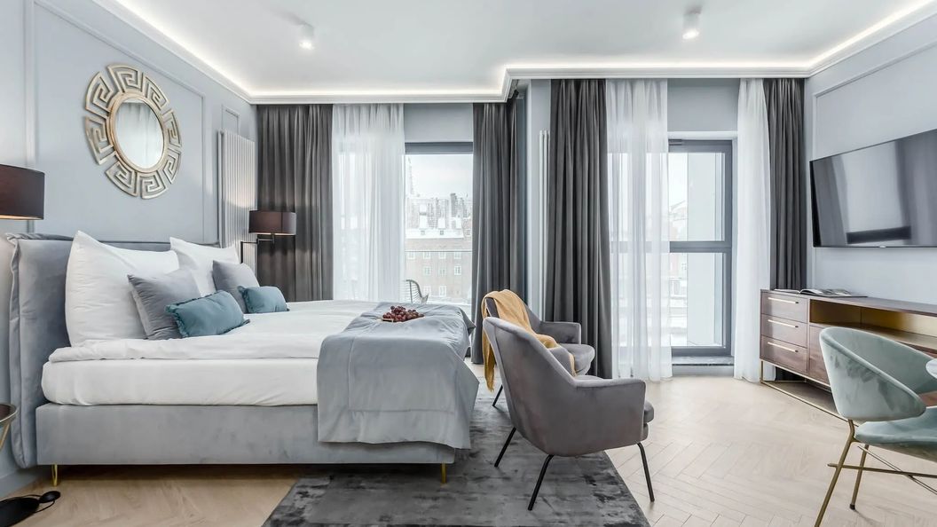 Nowocześnie urządzona przestrzeń przeznaczona jest dla maksymalnie 6 osób i składa się z salonu połączonego z częścią sypialnianą, dwóch oddzielnych sypialni oraz trzech łazienek. Wnętrze wyróżniają sięgające od podłogi do sufitu okna, z których roztacza się widok na ulicę Stągiewną, stanowiącą przedłużenie Długiego Targu. Aneks kuchenny wykończono elementami z marmuru, a całość utrzymana jest w stonowanej, spójnej kolorystyce.