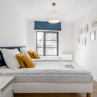Salon został połączony z aneksem kuchennym i częścią jadalnianą. W rogu pokoju ustawiono narożną błękitną sofę, która po rozłożeniu stanowić będzie miejsce do spania dla dwóch osób. Po drugiej stronie nad stołem jadalnianym z miejscem dla 5 osób zawieszono TV. Z pokoju prowadzi wyjście na balkon wyposażony w meble ogrodowe. Aneks kuchenny to przestrzeń stworzona do gotowania pysznych posiłków we własnym zakresie. Wśród udogodnień znalazły się tutaj płyta kuchenna, lodówka, zmywarka, mikrofala oraz czajnik wraz z zestawem do parzenia kawy i herbaty. W kuchni znajdują się również niezbędne przybory. W apartamencie wydzielono dwie sypialnie. Jedna z nich wyposażona została w łóżko małżeńskie, a druga w dwa pojedyncze łóżka z szafkami nocnymi i szafą na wasze bagaże. Dodatkowo w jednej z sypialni zaprojektowano miejsce do pracy - biurko wraz z krzesłem. Łazienka zachęca do relaksu pod prysznicem z deszczownicą. Wśród udogodnień oferujemy świeże ręczniki, zestaw kosmetyków oraz suszarkę do włosów. Do waszej dyspozycji oddajemy również pralkę.