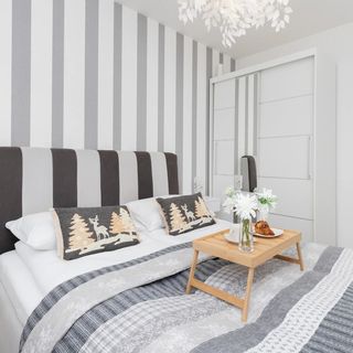 Łóżko podwójne, szafki nocne, lampki nocne, szafa z lustrami