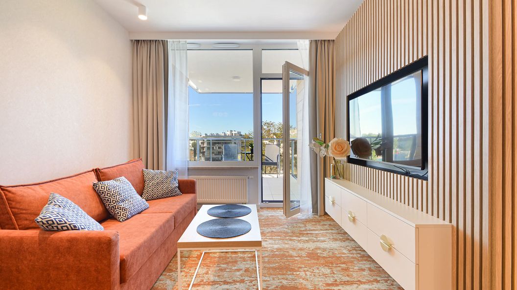 Oferta noclegowa przeznaczona jest dla maksymalnie 4 osób. Do dyspozycji gości jest sypialnia z łóżkiem małżeńskim oraz salon z rozkładaną sofą. Apartament posiada również łazienkę z prysznicem oraz balkon z meblami ogrodowymi, stanowiący dodatkowe miejsce do odpoczynku.