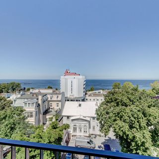 Horyzont 708 SeaView to apartament usytuowany w nowoczesnym budynku w centralnej części Międzyzdrojów, oferujący widok na morze i pobliską zabudowę.