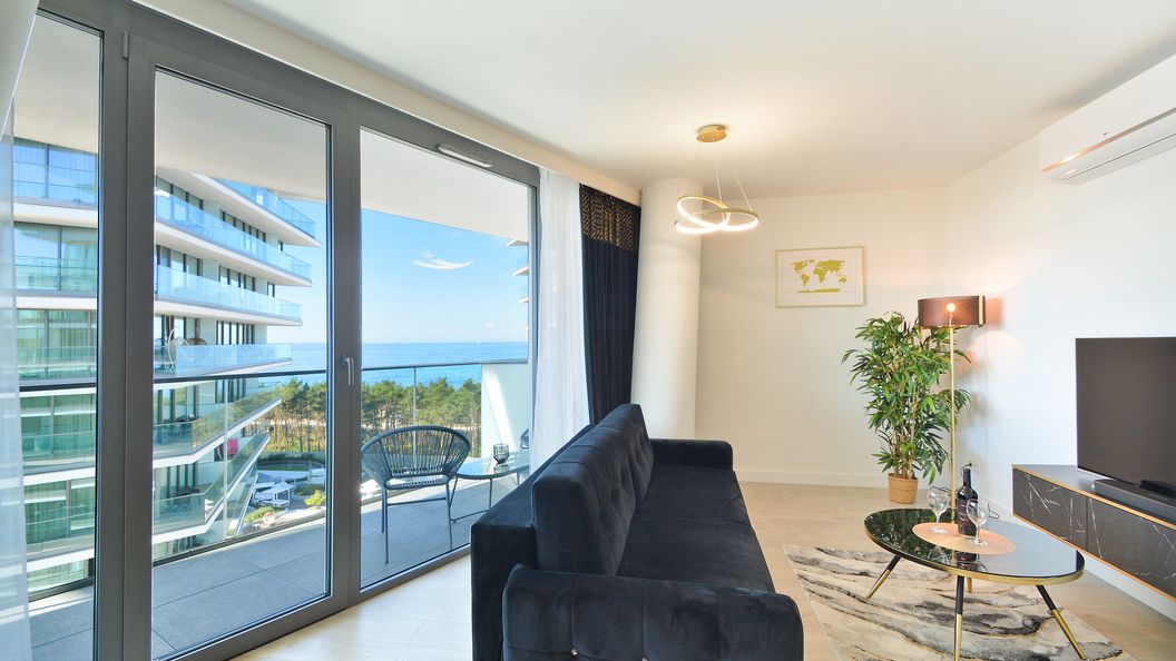 Nowoczesny apartament znajduje się na szóstym piętrze w budynku z windą. Jest w pełni klimatyzowany. Posiada miejsca noclegowe dla czterech osób – dwa w sypialni na podwójnym łóżku małżeńskim, a następne dwa w salonie na podwójnej rozkładanej sofie. To idealna opcja dla grupy lub podróżującej wspólnie rodziny. Przygotować pyszny posiłek można za pomocą dostępnej w aneksie kuchennym płyty indukcyjnej, a także tostera. Nie należy martwić się zmywaniem naczyń, w aneksie dostępna jest również zmywarka. Dodatkowym udogodnieniem znajdującym się w kuchennej zabudowie jest pralka. Zaparzonej w ekspresie przelewowym kawy można napić się na przynależącym do apartamentu balkonie, z którego rozpościera się przepiękny widok na Międzyzdroje, plażę oraz odrobinę morza. Obserwowanie wschodów i zachodów słońca oraz nocnego miasta z tak bajecznie położonego miejsca to punkt niemalże obowiązkowy. Łazienka wyposażona jest w prysznic, umywalkę oraz zestaw bezpłatnych kosmetyków. Apartament posiada dostęp do wszelkich udogodnień multimedialnych, m.in. szybkiego połączenia WiFi oraz telewizora z funkcją SmartTV+ i dostępem do telewizji naziemnej. Do apartamentu przynależy miejsce parkingowe w garażu podziemnym.