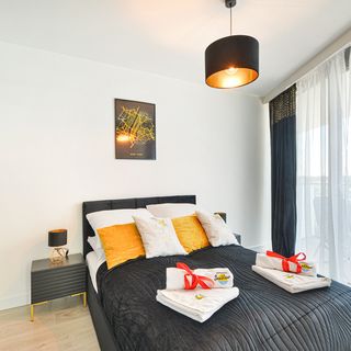 Łóżko małżeńskie podwójne, komplet pościeli, szafa, lampki i szafki nocne, wyjście na balkon.
