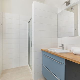 Prysznic, toaleta, umywalka, szafka, lustro, suszarka do włosów, zestaw kosmetyków, ręczniki