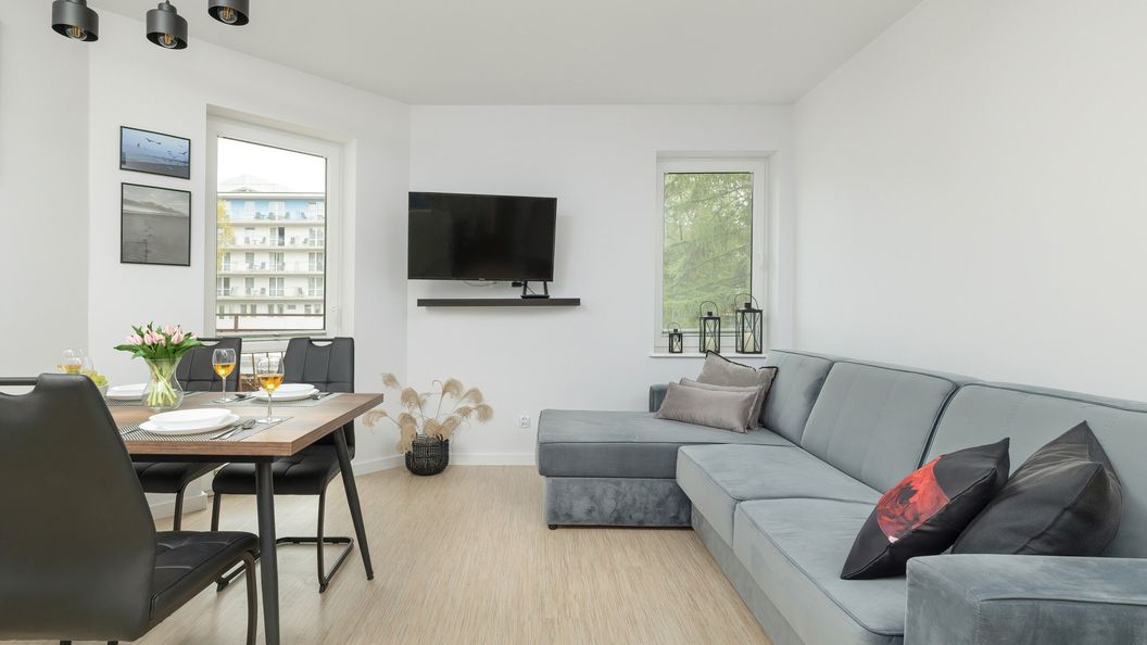 Apartament o powierzchni 37.2 m² może ugościć 4 osoby. Wnętrze zostało utrzymane w jasnych kolorach, dzięki czemu emanuje atmosferą świeżości i elegancji. Delikatne dodatki nadają wnętrzu lekkości i przytulności, tworząc idealne miejsce do spędzania czasu z rodziną i przyjaciółmi. Apartament składa się z części wypoczynkowej, w której dominuje rozkładana sofa, na której Goście mogą zrelaksować się podczas oglądania telewizji. Z salonu prowadzi wyjście na uroczy balkon, gdzie Goście mogą delektować się chwilą relaksu na eleganckich meblach ogrodowych, gdzie przy dźwiękach natury, mogą zanurzyć się w atmosferze spokoju i harmonii, delektując się świeżo zaparzoną kawą z ekspresu przelewowego. Aneks kuchenny, harmonijnie wpisany w salon, zachęca do kulinarnych eksperymentów. Wyposażony w nowoczesne urządzenia, w tym lodówko-zamrażarkę, płytę indukcyjną i kuchenkę mikrofalową, ułatwia codzienne przygotowywanie posiłków. Funkcjonalny stół z czterema krzesłami stanowi idealne miejsce do spożywania posiłków oraz spotkań przy kawie. Sypialnia to oaza spokoju i relaksu, gdzie delikatne oświetlenie i jasne kolory sprzyjają wypoczynkowi, natomiast wygodne pojedyncze łóżka zapewniają komfortowy sen. W łazience każdy krok staje się wizytą w oazie spokoju i świeżości. W centralnym punkcie znajduje się prysznic, który zapewnia nie tylko odświeżenie, ale także chwilę relaksu i regeneracji po dniu pełnym wrażeń. Ten apartament to idealny wybór dla tych, którzy cenią sobie jasne, przestronne wnętrza oraz wygodę w codziennym życiu.
