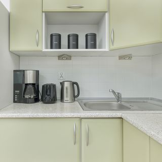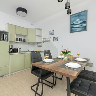 Płyta indukcyjna, lodówka, zamrażarka, czajnik elektryczny, toster, kuchenka mikrofalowa, ekspres do kawy (przelewowy), opiekacz, stół z 4 krzesłami, zastawa kuchenna