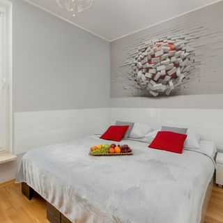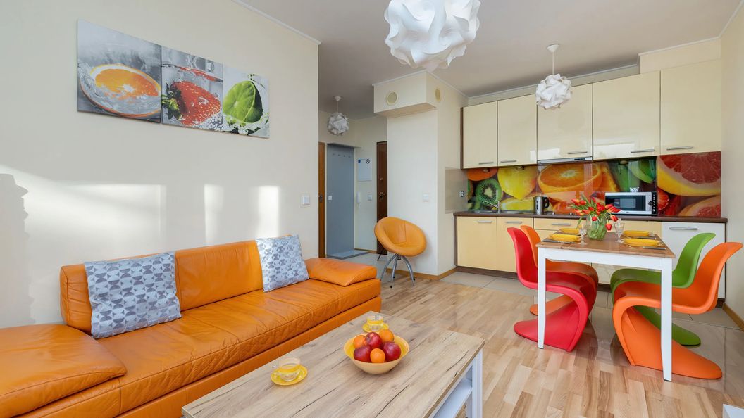 Ten przytulny apartament został urządzony z wykorzystaniem żywych odcieni – pomarańczowe i czerwone akcenty sprawiają, że jest to ciekawa kompozycja estetyczna kojarząca się z energią i aktywnością. Lokal znajduje się na drugim piętrze budynku i dysponuje umeblowanym balkonem, na którym można usiąść, aby podziwiać widok na krajobraz leśny czy też napić się porannej kawy w przyjaznej atmosferze. W sypialni stoi wygodne łóżko dwuosobowe. Salon został wyposażony w dwuosobową sofę rozkładaną, telewizor oraz jadalniany stół z krzesłami i stolik. W pomieszczeniu znajdują się również dwa pomarańczowe fotele. Goście mają tutaj dostęp do telewizji satelitarnej. W aneksie kuchennym znajdują się sprzęty takie jak lodówka z zamrażarką, kuchenka mikrofalowa, a także zmywarka. Jest to wspaniałe miejsce do wypoczynku zarówno dla rodziców podróżujących z dziećmi, jak i par. W łazience na odwiedzających czeka zestaw kosmetyków, suszarka do włosów, prysznic i pralka. Do dyspozycji przyjezdnych jest również miejsce postojowe w hali garażowej. Z pewnością warto przyjechać tutaj, gdy chce się zapomnieć na moment o codziennych obowiązkach.