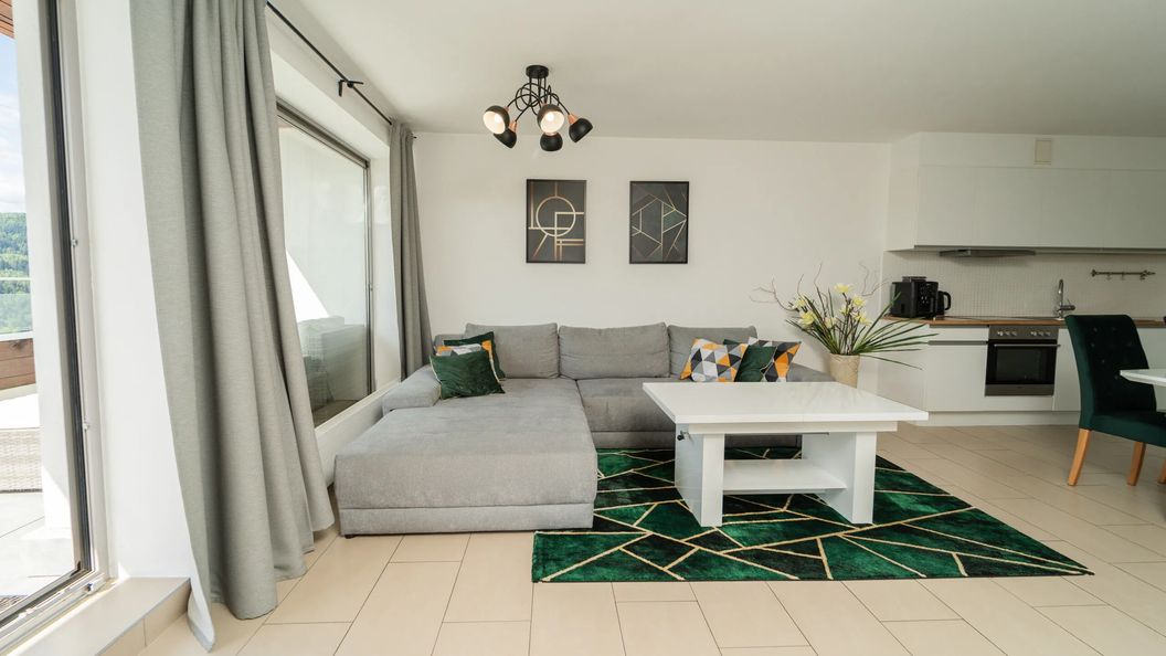 Apartament znajduje się na parterze budynku i jest przeznaczony dla 4 osób. Obszerne wnętrze składa się z salonu połączonego z aneksem kuchennym, dwóch sypialni oraz łazienka z wanną i toalety. Salon jest sercem mieszkania, gdzie przestrzeń płynnie łączy się z otwartą kuchnią, tworząc idealne miejsce do wspólnego spędzania czasu. Część dzienna salonu wyposażona jest w fotel, dwie sofy i telewizor. Z salonu można wyjść na umeblowany taras, gdzie można delektować się filiżanką kawy napawając się niesamowitym widokiem na Beskid. Niewątpliwe dużym atutem są oddzielne sypialnie z wygodnymi łóżkami małżeńskimi, które zapewnią komfortowy wypoczynek po dniu pełnym wrażeń. Goście mogą korzystać również z szybkiego bezpłatnego łącza WiFi. Szeroki wachlarz udogodnień oraz kompleksowe wyposażenie apartamentu w niezbędne akcesoria i sprzęty kuchenne, dzięki którym można przygotować smaczne domowe posiłki. Łazienka została również wyposażona w niezbędne akcesoria, które umilą pobyt. Apartament szczególnie przypadnie do gustu osobom podróżującym z ze swoimi pupilami, ponieważ jest przyjazny zwierzętom.