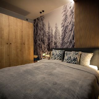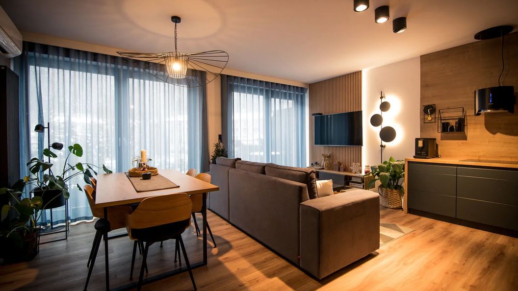 Przestrzeń apartamentu została zaprojektowana z myślą o komforcie maksymalnie 6 osób. Na dwóch poziomach mieszczą się dwie oddzielne sypialnie, każda wyposażona w łóżko małżeńskie, oraz salon z rozkładaną sofą. Wnętrze wyróżnia się nowoczesnym wystrojem, w którym dominują odcienie szarości połączone z elementami drewna, tworząc spójną i elegancką całość.