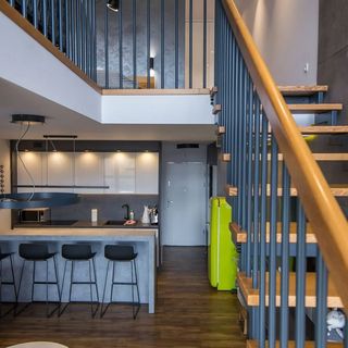 Czajnik elektryczny, płyta indukcyjna, kuchenka mikrofalowa, lodówka z zamrażarką, ekspres do kawy, zmywarka, komplet naczyń, przybory kuchenne, wyspa kuchenna z krzesłami
