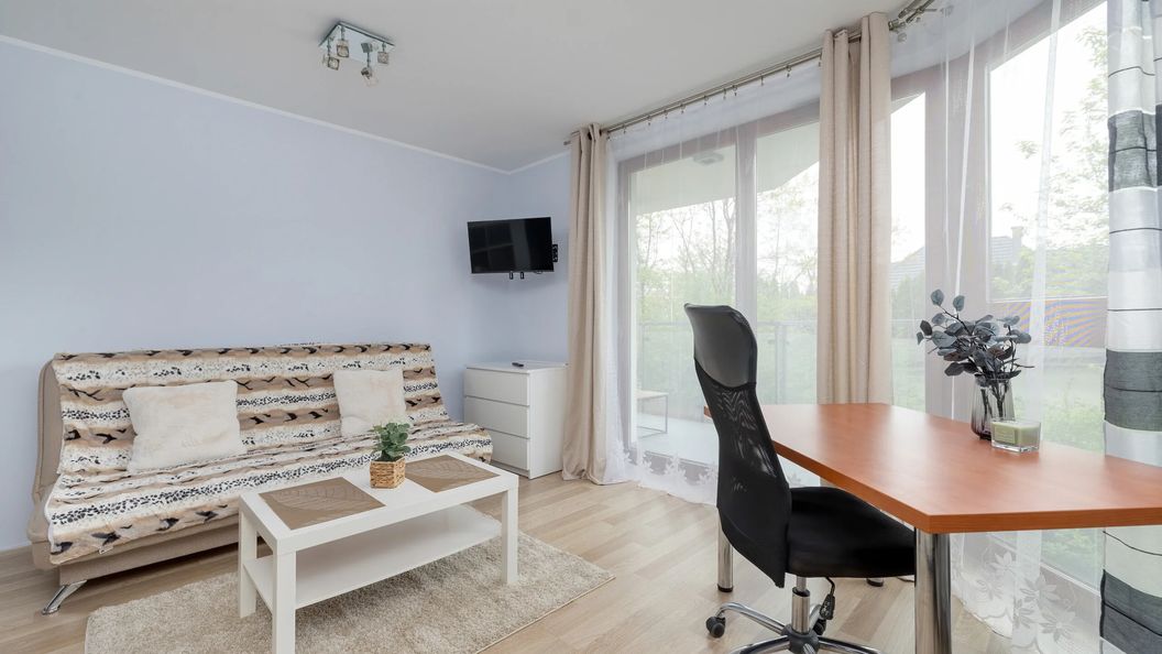 Rozkładana sofa, stolik kawowy, telewizor, biurko z krzesłem, wyjście na balkon