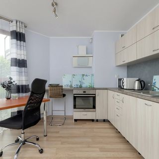 To wyjątkowe studio usytuowane jest w Krakowie przy ulicy Żabiniec 101A. Jest to doskonała propozycja na weekendowy pobyt w mieście oraz dla osób podróżujących służbowo. Okolica posiada rozwiniętą infrastrukturę handlowo-usługową co niewątpliwie wpłynie korzystnie na komfort pobytu. Dzięki temu, że studio zlokalizowane jest około 2.6 km od Rynku Głównego, można cieszyć się spokojem oraz relaksem z dala od gwaru i tłumu turystów, jednocześnie mając łatwy dostęp do jednego z najważniejszych i najpiękniejszych miejsc w Krakowie. W okolicy znajduje się dobrze rozwinięta sieć komunikacji miejskiej, co ułatwia podróżowanie po mieście. Do najbliższego przystanku tramwajowego można dojść w około 10 minut. W pobliżu znaleźć można tereny zielone, które będą doskonałą propozycją na spędzanie czasu na łonie natury. Do Parku Białoprądnickiego, w którym znajduje się Dworek Białoprądnicki, pełniący funkcję domu kultury droga wynosi około 20 minut spacerem. Okolica oferuje wiele restauracji oraz kawiarni, gdzie można delektować się pysznym jedzeniem i napojami oraz spędzać czas w miłej atmosferze. Do dworca kolejowego Kraków Olsza droga wynosi 2.4 km. Na lotnisko w Krakowie można dojechać taksówką lub samochodem w około 25 minut. Położenie studia gwarantuje komfortowe, praktyczne i stylowe miejsce noclegowe w Krakowie.
