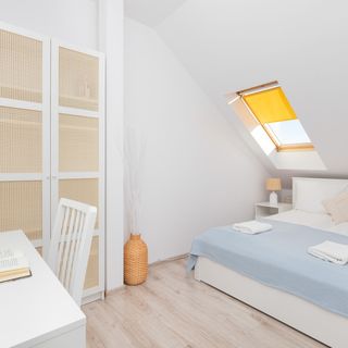 Podwójne łóżko, szafka i lampka nocna, szafa, biurko z krzesłem.