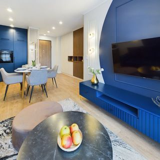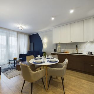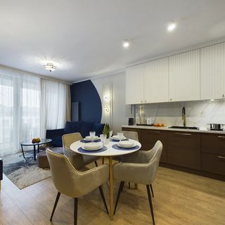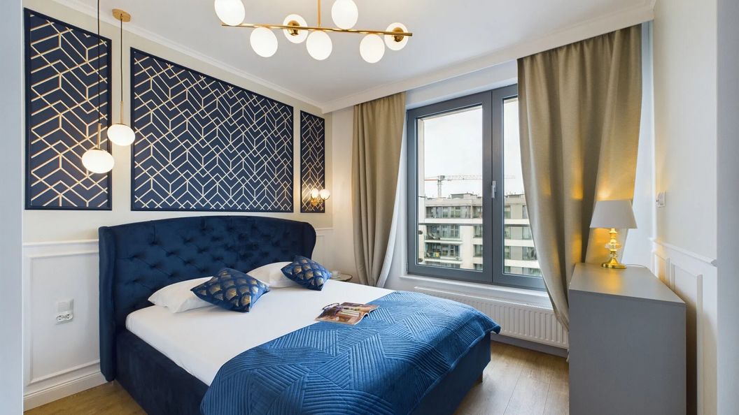 Stylowy apartament o powierzchni 44 m² może ugościć 4 osoby. Będzie doskonałym miejscem noclegowym dla rodzin z dziećmi lub grup przyjaciół pragnących wypocząć w Gdyni. Wystrój apartamentu został zaprojektowany w eleganckich kolorach, beżu, granatu oraz z elementami drewna. Funkcjonalne wyposażenie oraz dodatki sprawią, że pobyt będzie niezwykle komfortowy i niezapomniany. Apartament składa się z salonu, sypialni, aneksu kuchennego, łazienki oraz umeblowanego balkonu. W salonie znajduje się wygodna rozkładana sofa, nowoczesny telewizor, komoda oraz stolik kawowy. Został zapewniony również dostęp do Internetu w postaci sieci WIFI. Sypialnia posiada komfortowe łóżko małżeńskie, komodę oraz świeżą pościel dla naszych Gości. Aneks kuchenny został wyposażony we wszystkie przybory, niezbędne do przygotowywania posiłków oraz stół z krzesłami, przy którym można wygodnie usiąść całą rodziną. W łazience dostępna jest kabina prysznicowa, suszarka do włosów, pralka oraz ręczniki dla Gości. Na umeblowanym balkonie można rozkoszować się filiżanką ulubionej kawy z ekspresu i miło rozpocząć nowy dzień.