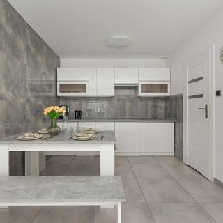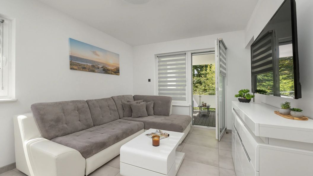 Komfortowy apartament mieści się na pierwszym piętrze i oferuje nocleg dla czterech osób. Stanowi idealną opcję dla rodzin lub podróżujących wspólnie grup. Wystrój utrzymany jest w eleganckim, jasnym stylu, a wnętrza dopełniają nowoczesne dodatki w szarych odcieniach. Dwa miejsca noclegowe znaleźć można w sypialni na dużym łóżku typu king-size, a kolejne dwa w salonie na podwójnej rozkładanej sofie. Aneks kuchenny jest w pełni wyposażony i przystosowany do przyrządzania pysznych posiłków. Znajduje się w nim między innymi kuchenka elektryczna oraz toster. Zmywarka z pewnością przyda się po obfitym obiedzie. Ogromną zaletą apartamentu jest duży, umeblowany balkon, który idealnie sprawdzi się jako strefa odpoczynku po dniu pełnym wrażeń oraz pozwoli napić się zaparzonej w dostępnym ekspresie przelewowym porannej filiżanki kawy. Łazienka wyposażona jest w prysznic, ręczniki oraz specjalny zestaw kosmetyków. Duże, podświetlane lustro i jasne elementy dopełniają nowoczesne wnętrze. Pralka przyda się w trakcie dłuższych wyjazdów. Udogodnienia multimedialne stanowią dostępne w każdym pomieszczeniu szybkie połączenie WiFi oraz telewizor z płaskim ekranem (SmartTV+) i pakietem telewizji naziemnej. Miejsce jest przyjazne zwierzętom. Do apartamentu przynależy miejsce parkingowe.