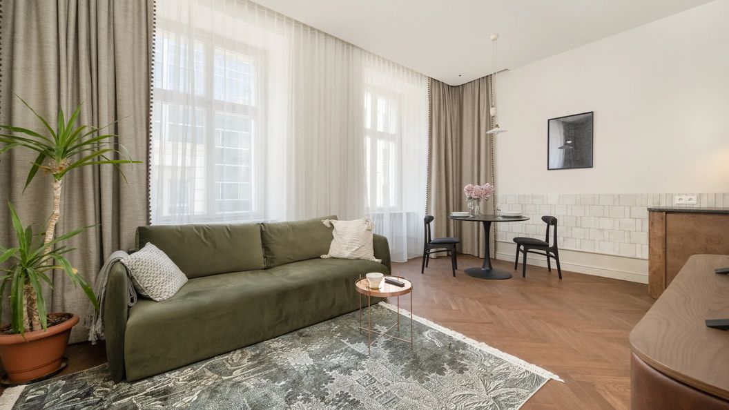 Ten wyjątkowy apartament o powierzchni 67,79 m2 zapewni wygodne miejsce noclegowe dla 4 osób. Jest to doskonały wybór na romantyczny pobyt we dwoje lub dla grupy przyjaciół. Stylowe, a zarazem przytulne wnętrza apartamentu wprowadzają w spokojny nastrój, a w pełni funkcjonalne wyposażenie gwarantuje wygodę pobytu na wysokim poziomie. Dodatki i meble w stylu retro to połączenie klasycznego wystroju z elementami nowoczesności. Dodatkowego klimatu dodaje fakt, iż apartament znajduje się w zabytkowej kamienicy. Z okien apartamentu rozpościera się widok na historyczne uliczki Wrocławia. Rozkład pomieszczeń obejmuje salon z aneksem kuchennym, sypialnię oraz łazienkę z prysznicem. Część dzienna to elegancka przestrzeń do relaksu i spędzania czasu z najbliższymi. Wygodna, miękka sofa z funkcją spania zaprasza do odpoczynku. Designerski stół to miejsce do spożywania wspólnych posiłków, a zarazem spójne połączenie salonu z aneksem kuchennym. Wystrój aneksu kuchennego harmonijnie komponuje się z pozostałą częścią pomieszczenia. Dzięki wysokiej jakości sprzętom, takim jak płyta indukcyjna, piekarnik, zmywarka czy lodówka daje możliwość przyrządzania domowych posiłków. Duża sypialnia to wyjątkowa przestrzeń dla osób ceniących połączenie wygody z elegancją w wyjątkowym stylu. Łóżko w rozmiarze king size zapewni spokojny sen i pozwoli na regenerację sił po dniu pełnym wrażeń. Charakterystycznym punktem sypialni jest przestronna szafa, która pomieści wszystkie osobiste przedmioty i bagaże. W wykuszu znajduje się pasujące do wnętrza drewniane biurko, które zapewnia komfort pracy lub nauki przed komputerem. Przyjemne ochłodzenie zapewni wiatrak sufitowy. Designerska łazienka została wyposażona w prysznic z deszczownicą. Wieczorną rozrywkę zapewniają multimedia, takie jak telewizor z płaskim ekranem z funkcją Smart TV i telewizją naziemną oraz bezpłatny dostęp do WiFi. Dla wygody naszych Gości, zapewniamy bezpłatny zestaw kosmetyków, ręczniki oraz świeżą pościel. Nasz apartament wyróżnia się nie tylko stylowym wystrojem, ale również starannym wykończeniem, zapewniającym przyjemną atmosferę i niezapomniany pobyt.