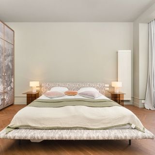 Łóżko king size, szafa, dwa stoliki nocne z lampkami, biurko z krzesłem