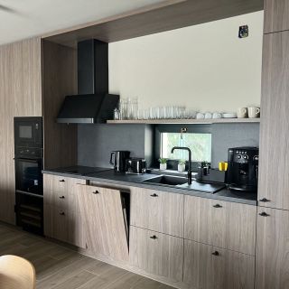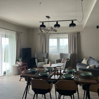 Do dyspozycji gości jest cały, niezależny dom przeznaczony dla maksymalnie 6 osób. W jego wnętrzu znajduje się salon z kominkiem i telewizorem Smart TV, a także w pełni wyposażona kuchnia, która obejmuje zmywarkę, płytę grzejną, lodówkę oraz kuchenkę mikrofalową. Dom posiada osobne wejście oraz balkon lub taras.