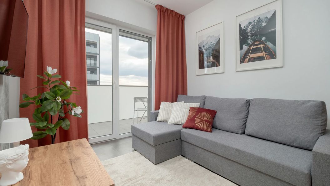 Na ósmym piętrze znajduje się elegancki apartament typu studio, który oferuje komfortowe miejsca noclegowe dla czterech osób. Wnętrze urzeka starannym wykończeniem oraz stylowymi dodatkami, tworząc przytulną i jednocześnie nowoczesną atmosferę. Przestrzeń została zaplanowana z myślą o wygodzie i funkcjonalności, co sprawia, że jest idealna zarówno dla par, małych grup oraz rodzin. Centralnym punktem apartamentu jest przestronny salon, w którym znajduje się podwójne łóżko typu king-size, zapewniające wyjątkowy komfort snu. Dodatkowo do dyspozycji Gości pozostaje również podwójna rozkładana sofa, która z łatwością zamienia się w wygodne miejsce do spania dla dwóch osób. Aneks kuchenny jest w pełni wyposażony, oferując płytę indukcyjną, piekarnik oraz zmywarkę, co umożliwia przygotowywanie posiłków w domowych warunkach. Stylowe wykończenie kuchni harmonizuje z resztą wnętrza, tworząc spójną i estetyczną całość. Z salonu można wyjść na umeblowany balkon, idealny do relaksu przy porannej kawie. Z balkonu rozciąga się widok na okolicę. Łazienka wyposażona jest w nowoczesny prysznic, a dla wygody gości przygotowano ręczniki oraz specjalny zestaw bezpłatnych kosmetyków. W apartamencie znajduje się również pralka, co jest dodatkowym udogodnieniem dla tych, którzy planują dłuższy pobyt. Dla miłośników multimedialnych rozrywek przygotowano telewizor z funkcją SmartTV+ oraz szybkie połączenie WiFi. To miejsce, które łączy w sobie elegancję, wygodę oraz funkcjonalność, stając się doskonałym wyborem na każdy pobyt. Goście podróżujący ze swoimi pupilami są mile widziani. Do apartamentu przynależy miejsce parkingowe na parkingu naziemnym.