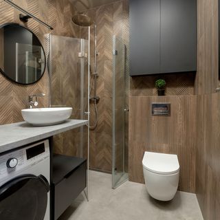 Prysznic typu walk-in, pralko-suszarka, umywalka, toaleta, lustro, szafki, ręczniki, suszarka do włosów.