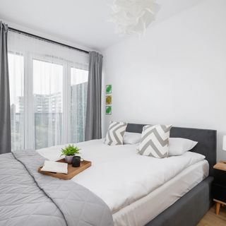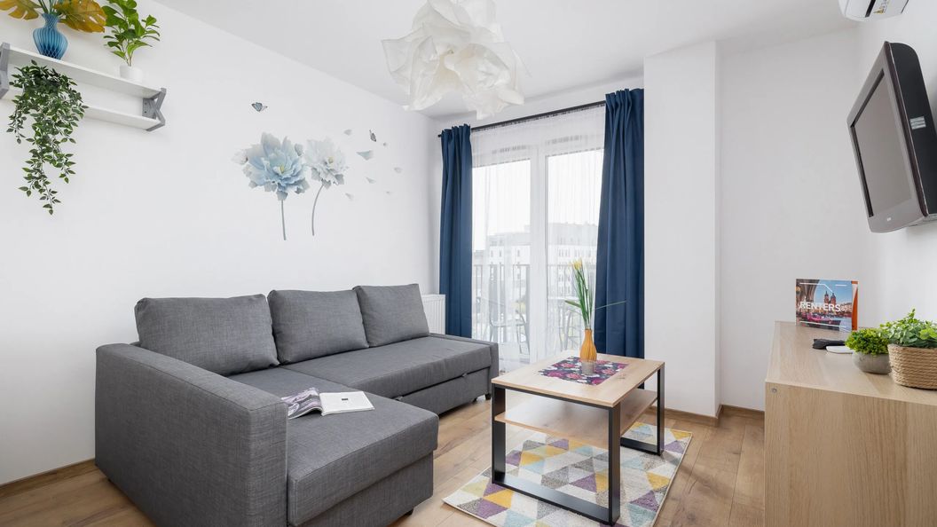Przestrzeń przeznaczona jest dla maksymalnie 4 osób. Składa się z osobnej sypialni z dużym łóżkiem dwuosobowym i pojemną szafą oraz salonu. W pokoju dziennym znajduje się rozkładana sofa narożna, stół z krzesłami oraz miejsce wyznaczone do pracy zdalnej. Wnętrze utrzymane jest w stonowanej kolorystyce beżu i szarości, co sprzyja wypoczynkowi.