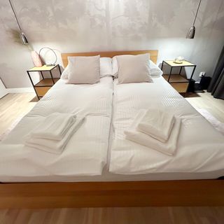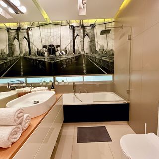 Przestronny apartament o wysokim standardzie może pomieścić do 5 osób. Składa się z przytulnego salonu, w pełni wyposażonej sypialni, wygodnego gabinetu, który doskonale sprawdzi się jako miejsce do pracy lub dodatkowa przestrzeń sypialna, oraz nowoczesnej łazienki. Kuchnia jest w pełni wyposażona, idealna do przygotowywania posiłków.