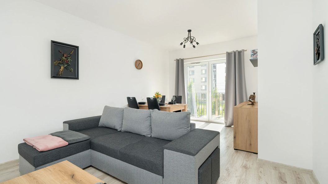 Ten stylowy apartament oferuje wygodę i elegancję w nowoczesnym wydaniu. Jest on przeznaczony dla czterech osób. Lokal z subtelnym wystrojem w odcieniach beżu i szarości to doskonały wybór dla rodziców podróżujących z dziećmi i przyjaciół planujących wspólny wyjazd. Pierwsza sypialnia to przestrzeń wyposażona w komfortowy, rozkładany narożnik dwuosobowy. Znajdują się tu również szafki, telewizor oraz jadalniany stół z krzesłami, idealny na wspólne posiłki. Całość dopełnia stolik kawowy, tworząc funkcjonalną przestrzeń do relaksu. Druga sypialnia ma do zaoferowania podwójne łóżko. Szafki zapewniają tu optymalną ilość miejsca do przechowywania, a stonowane kolory wnętrza dodają przytulności. We w pełni wyposażonej kuchni, można szybko przygotowywać dania i przekąski. Do dyspozycji gości jest tutaj lodówka z zamrażarką, kuchenka mikrofalowa, płyta indukcyjna, piekarnik, czajnik i zmywarka. Każde urządzenie zostało starannie dobrane, aby zapewnić odwiedzającym wysoki komfort użytkowania sprzętów. W łazience na gości czeka suszarka, komplet ręczników, pralka i prysznic. W przedpokoju mieści się pojemna szafa, w której umieszczono stojącą suszarkę do ubrań, żelazko, deskę do prasowania i odkurzacz. Relaks na powietrzu umożliwia umeblowany balkon z widokiem na zieleń, który jest idealnym miejscem na poranną kawę.