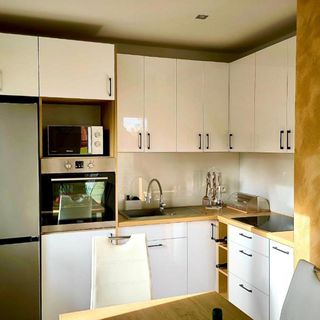 W pełni wyposażony aneks kuchenny: płyta elektryczna, lodówka, mikrofala, piekarnik, opiekacz, czajnik elektryczny.