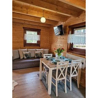 W naszej ofercie posiadamy całoroczny domek dla 6-8 osób. Posiada on salon z aneksem kuchennym, łazienkę z prysznicem i dwie sypialnie. Na parterze znajduje się ciepły i klimatyczny pokój z dużą kanapą posiadającą funkcję spania. W salonie znajduje się TV oraz rozkładany stół. Kuchnia jest w pełni wyposażona - lodówka, piekarnik, czajnik, płyta indukcyjna, pełna zastawa. Na piętrze są dwie sypialnie - jedna z balkonem. W każdym z pokoi znajduje się podwójne i pojedyncze łóżko oraz szafa.