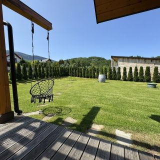 Cały teren wokół chaty jest ogrodzony, co zapewnia prywatność i bezpieczeństwo. Na gości czeka duży ogród z miejscem na ognisko oraz zadaszony grill, idealny do wieczornych spotkań. Z myślą o najmłodszych przygotowano plac zabaw, a dodatkową atrakcją jest hamak, na którym można odpocząć, ciesząc się ciszą i bliskością natury. Dostępny jest również bezpłatny, prywatny parking.