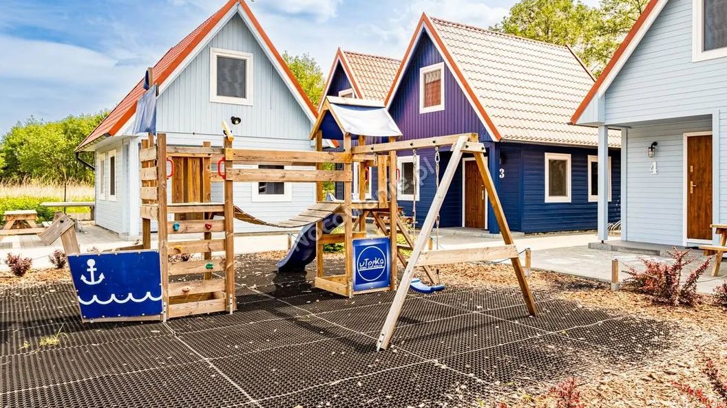 uTopka to kompleks 6 domków o powierzchni ok. 60 m2 w zabudowie pojedynczej lub bliźniaczej. Pierwsze piętro posiada dwie sypialnie, w każdej po dwa pojedyncze łóżka (w wybranych domkach możliwość zmiany konfiguracji). Na parterze łazienka i salon z rozkładaną kanapą oraz aneksem kuchennym w pełni wyposażonym.