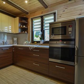 * kuchnia wyposażona w niezbędne naczynia (talerze, sztućce, szklanki, filiżanki, garnki itp.) i urządzenia (duża lodówka z zamrażalnikiem, płyta indukcyjna, kuchenka mikrofalowa, zmywarka, piekarnik, ciśnieniowy ekspres do kawy – na kawę mieloną); DOMEK „1” nie posiada w kuchni ZMYWARKI i PIEKARNIKA