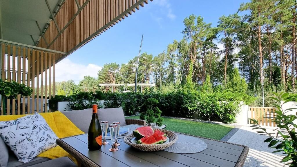 Nowoczesny, przestronny, dwupoziomowy apartament z tarasem położony przy promenadzie, przy wejściu na plażę. Składa sięz dwóch sypialni, pokoju dziennego z aneksem kuchennym i łazienki. Duże przeszklenia i panoramiczne okna gwarantują piękne oświetlenie w apartamencie. Na piętrze apartamentu znajdują się 2 sypialnie z łożami małżeńskimi 160x220cm z panoramicznymi oknami na promenadę oraz łazienka z prysznicem, uwywalką, toaletą i pralką. Na korytarzu piętra znajduje się klimatyzacja, która schładza obie sypialnie. Na parterze apartamnetu przestronny salon z wyjściem na 145m2 taras, aneks kuchenny w pełni wypasożony: kuchenka 4 palnikowa, piekarnik, mikrofalówka, toster, ekspres przelewowy. W części wypoczynkowej salonu znajduje się rozkładana sofa narożnikowa oraz część telewizyjna (TV z polskimi oraz niemieckimi kanałami). Na parterze znajduje się również dodatkowa toaleta z wc. Do dyspozycji gości jest umeblowany taras (sofa, stolik, leżaki), z którego zejść można bezpośrednio na promenadę. W apartamencie jest internet bezprzewodowy oraz polsko-niemiecka telewizja. Małe, zrównoważone pieski są mile widziane. W pobliżu budynku znajduje się Promenada Zdrowia tworząca część transgraniczej promenady łączącej Świnoujście z niemieckimi kurotrtami Ahlbeck, Heringsdorf i Bansi, ścieżka rowerowa, "siłownia" na świeżym powietrzu, ogród sensoryczny i lodziarnie, kawiarenki. Posiadamy 1 miejsce postojowe w hali garażowej ( dodatkowo płatne ), KONIECZNA REZERWACJA PRZED PRZYJAZDEM, ograniczona ilość miejsc. Parkować można na ogólnodostępnych miejscach postojowych - obowiązuje strefa płatnego parkowania.
