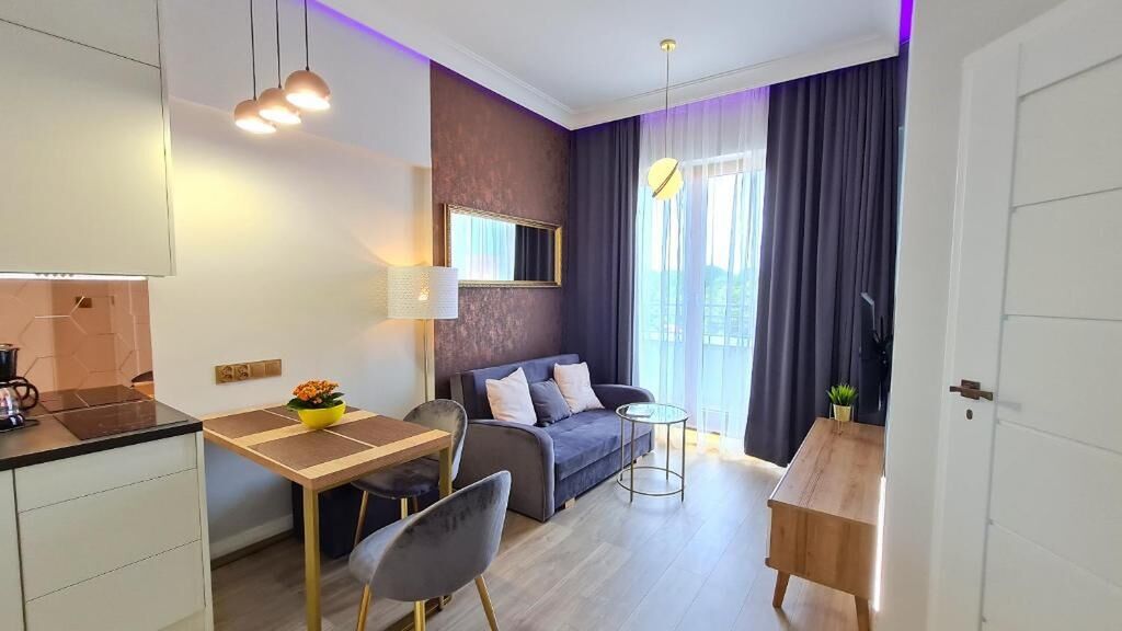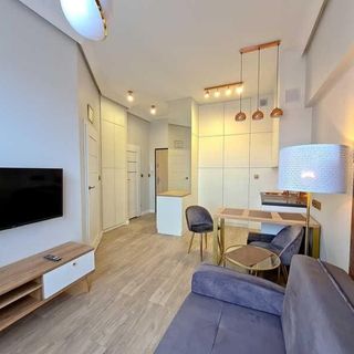Nowocześnie zaaranżowany dwupokojowy aprtament (31m2) położony jest na 4 piętrze w nowego budynku Platan Tower. Składa się z pokoju dziennego z aneksem kuchennym i sypiani.