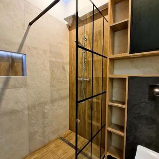 Łazienka z kabiną prysznicową bezprogową (z odpływem szczelinowym), umywalką i wc.