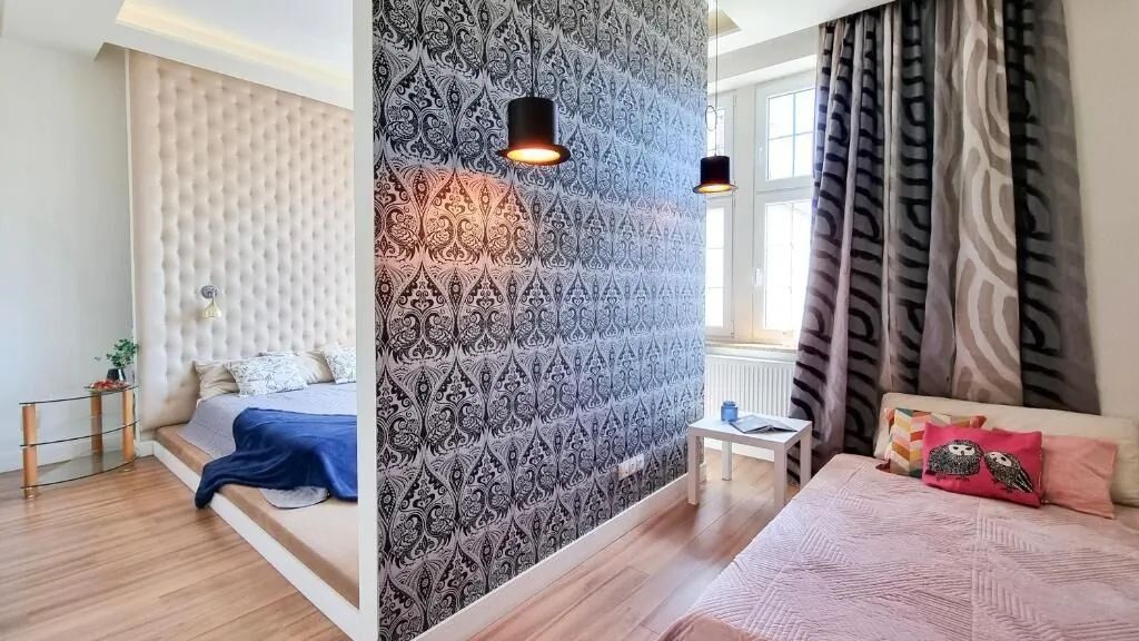 Wszystkie pomieszczenia w apartamencie mają charakter otwarty. Duża, otwarta sypialnia ma dwa łóżka do spania. Jedno z nich znajduje się na podwyższeniu, drugie łóżko o powiuerzchni spania 140x200cm. Dodatkowe miejsce do spania tworzy 1 osobowa rozkładana sofa.