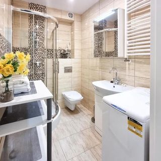 W apartamencie znajduje się w pełni wyposażony aneks kuchenny, który obejmuje płytę grzejną, lodówkę, kuchenkę mikrofalową, toster oraz ekspres przelewowy i komplet niezbędnych naczyń. Łazienka została wyposażona w kabinę prysznicową oraz pralkę, co jest istotnym udogodnieniem podczas dłuższych pobytów. W salonie dostępny jest telewizor LCD.