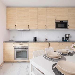Apartament dla sześciu osób charakteryzuje się jasnym i eleganckim wystrojem, który łączy komfort z nowoczesnymi udogodnieniami. W jego skład wchodzą trzy przestronne sypialnie, gdzie każda wyposażona jest w duże, podwójne łóżko typu king-size. Dodatkowo w każdej z sypialni znajduje się biurko z krzesłem, co tworzy idealne warunki do pracy zdalnej. W jednej z sypialni goście mogą korzystać z bezpośredniego wyjścia na umeblowany balkon, który jest doskonały do porannego relaksu na świeżym powietrzu. W pełni wyposażona kuchnia oferuje wszystko, co niezbędne do przygotowania posiłków, w tym kuchenkę elektryczną, mikrofalówkę oraz zmywarkę. Miejsce jadalniane znajduje się w kuchni. Apartament zapewnia również szybki dostęp do sieci WiFi w każdym z pomieszczeń, co gwarantuje niezakłócone korzystanie z internetu. Łazienka została wyposażona w zestaw bezpłatnych kosmetyków i świeże ręczniki, co podnosi komfort pobytu. Pralka z pewnością przyda się w trakcie dłuższych pobytów. Do dyspozycji gości pozostają także dwa miejsca parkingowe w garażu podziemnym.