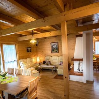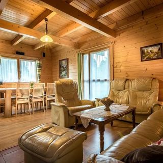 Drewniany dom jest do Państwa dyspozycji przez cały rok o łącznej pojemności 8 łóżek. Parter składa się z części dziennej, w której można zrelaksować się, oglądając telewizję internetową i Netflix z wygodnej sofy. Nie tylko romantyczną atmosferę, ale i ciepłe uczucie wywoła trzaskające drewno w kominku, które dominuje w przestrzeni. Z połączonej jadalni wyjdziesz na taras, na którym możesz delektować się poranną kawą. W pełni wyposażona kuchnia zapewni Ci wszystko, czego potrzebujesz, aby wyczarować pyszny posiłek. Można korzystać z piekarnika elektrycznego, płyty ceramicznej, kuchenki mikrofalowej, czajnika, lodówki, zamrażarki, zmywarki i tostera. Uzupełnieniem tego piętra jest łazienka z prysznicem i toaletą.