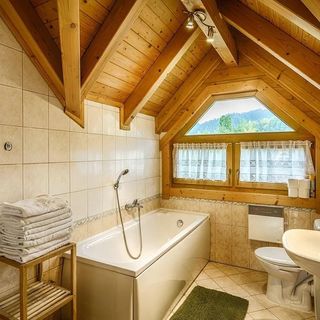 Pierwsze piętro to nocna część budynku. Dla idealnego snu możesz wybrać jedną z trzech sypialni. Dwa są 2-osobowe z podwójnym łóżkiem, jeden jest 4-osobowy z podwójnym łóżkiem i dwoma pojedynczymi łóżkami. Każda z sypialni posiada osobne wyjście na balkon. Możesz odświeżyć się i zrelaksować w tym samym czasie po aktywnym dniu w wannie z hydromasażem, którą znajdziesz w łazience wraz z toaletą.