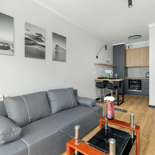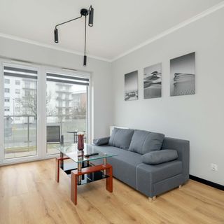 Rozkładana sofa, pościel, stolik kawowy, szafa, SmartTV, wyjście na balkon