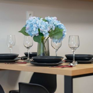 Stół z krzesłami, płyta kuchenna indukcyjna, kuchenka mikrofalowa, lodówka, czajnik, przybory kuchenne; naczynia, sztućce, garnki, patelnia, kieliszki do wina