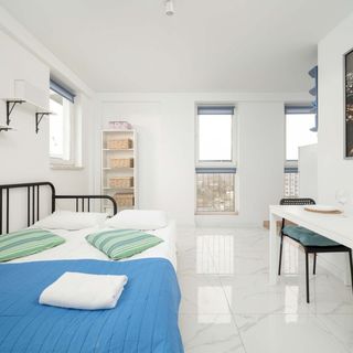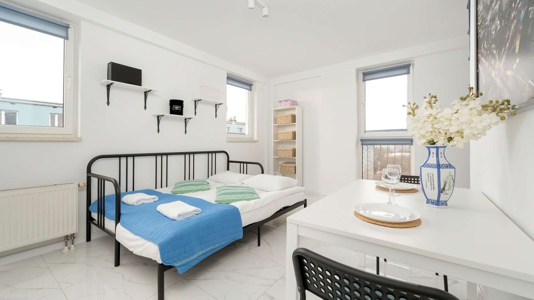 Studio położone na dziesiątym piętrze to idealna przestrzeń dla dwóch osób, zaprojektowana z myślą o parze lub osobach podróżujących w pojedynkę. Wnętrze jest jasne, nowoczesne i przytulnie urządzone, co tworzy atmosferę sprzyjającą wypoczynkowi. Główna część apartamentu wyposażona jest w podwójne łóżko, które zapewnia wygodne miejsce noclegowe, a dzięki dużym oknom przestrzeń jest doskonale doświetlona naturalnym światłem. Aneks kuchenny został starannie zaprojektowany, aby spełniać potrzeby gości, oferując płytę indukcyjną, kuchenkę mikrofalową i inne niezbędne sprzęty, które pozwalają na przygotowanie posiłków. Łazienka wyposażona jest w prysznic, a do dyspozycji gości oddano miękkie ręczniki oraz zestaw bezpłatnych kosmetyków, co dodatkowo podnosi standard pobytu. Dostępna w apartamencie pralka staje się nieocenionym udogodnieniem podczas dłuższych wizyt. We wszystkich pomieszczeniach można korzystać z szybkiego połączenia WiFi, co ułatwia zarówno relaks, jak i pracę zdalną. Telewizor z płaskim ekranem zapewnia dodatkową rozrywkę multimedialną. Apartament jest przyjazny zwierzętom, co pozwala na podróżowanie z czworonożnymi przyjaciółmi bez obaw. Położenie na wysokim piętrze gwarantuje nie tylko większą prywatność, ale również możliwość podziwiania widoków na okolicę.