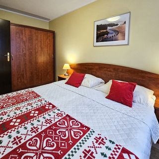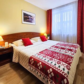 Apartament z pokojem dziennym i sypialnią o powierzchni 40m2 znajduje się na III piętrze budynku wyposażonego w windę. Sypialnia wyposażona jest w łoże małżeńskie, szafki nocne z dwiema lampkami oraz przestronną szafę. W pokoju dziennym znajduje się rozkładana sofa z funkcją spania (po rozłożeniu 135x195 cm), stolik kawowy, komoda z telewizorem LCD oraz stół z czterema krzesłami. Z pokoju dziennego wyjść można na balkon, na którym znajduje się stolik i dwa wiklinowe krzesła.