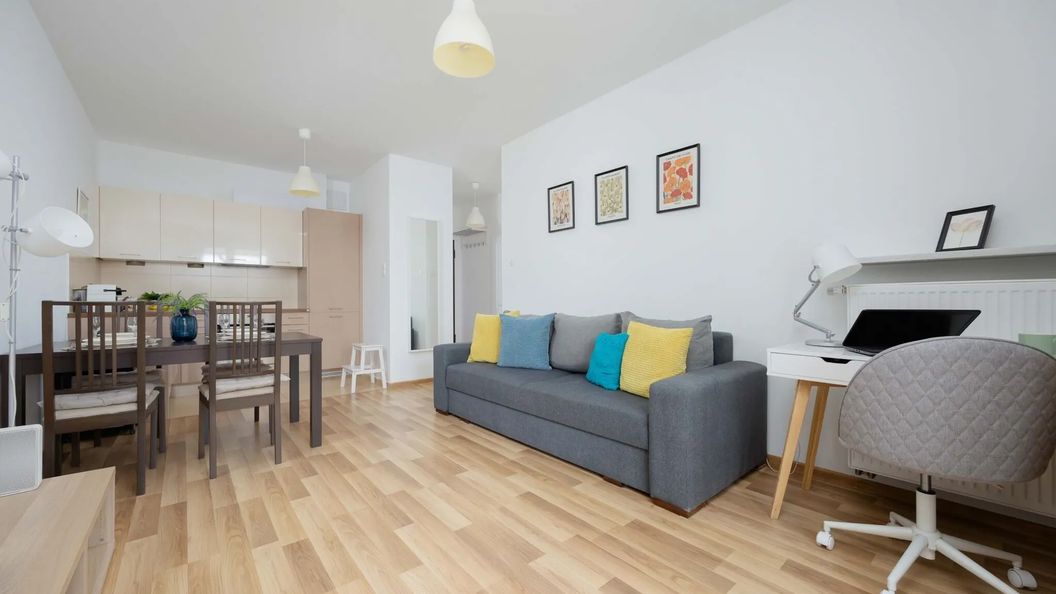 Apartament, o powierzchni 41,2 m², wygodnie pomieści do 4 osób, co czyni go idealnym miejscem na pobyt dla rodzin lub grupy przyjaciół. Wnętrze zostało zaprojektowane z dbałością o detale, emanując ciepłą atmosferą dzięki harmonijnej kolorystyce i stylowym akcentom dekoracyjnym. Salon, w którym znajduje się wygodna, rozkładana sofa, to doskonałe miejsce do odpoczynku i relaksu. Z salonu można wyjść na przestronny balkon, wyposażony w meble ogrodowe, idealny do spędzania czasu przy filiżance kawy zaparzonej w ekspresie. W apartamencie znajduje się również stół jadalniany, przy którym można wspólnie celebrować posiłki. Aneks kuchenny, w pełni wyposażony w wysokiej jakości sprzęt, sprawia, że gotowanie staje się prawdziwą przyjemnością. W sypialni znajduje się wygodne, podwójne łóżko, zapewniające komfortowy sen. Apartament wyposażony jest także w biurko, które stanowi idealne miejsce do pracy zdalnej lub nauki. Wśród multimedialnych udogodnień znajduje się płaski telewizor Smart TV z telewizją kablową oraz bezpłatne Wi-Fi. Łazienka, w której znajduje się pralka, zwiększa komfort podczas długoterminowych pobytów. Na dobry początek pobytu zapewniono bezpłatny zestaw kosmetyków, ręczniki oraz pościel. Dodatkowym atutem jest miejsce parkingowe w garażu podziemnym.