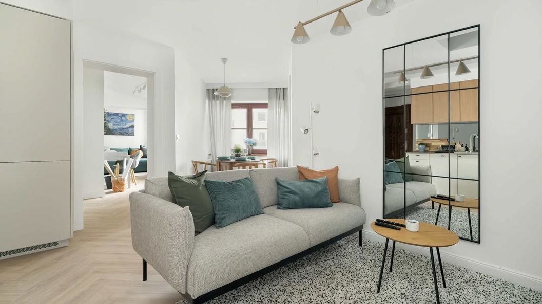 Ten przestronny, elegancki apartament dysponuje dwiema sypialniami i jest przeznaczony dla czterech osób. W jasnym wystroju dominują subtelne odcienie beżu, a o urozmaicenie aranżacji dba obecność delikatnych, zielonych i niebieskich akcentów. Nowoczesny salon ma do zaoferowania gościom wygodną sofę, na której można usiąść, aby zrelaksować się przy ulubionych programach w telewizji naziemnej. Pomieszczenie zostało wyposażone również w stolik, lustro, szafkę oraz jadalniany stół z krzesłami. Posiłki można przygotowywać w funkcjonalnie urządzonym aneksie kuchennym z takimi sprzętami jak piekarnik, kuchenka mikrofalowa, płyta indukcyjna, toster, czajnik elektryczny i pralka. W pierwszej sypialni znajduje się wygodne i duże łóżko dwuosobowe, fotel z podnóżkiem, stolik i pojemna szafa z lustrem idealna do przechowywania przywiezionych rzeczy. W drugiej sypialni umieszczono rozkładaną sofę dwuosobową, biurko z krzesłem umożliwiające komfortową pracę zdalną podczas wyjazdów biznesowych i szafę. Łazienka dysponuje powitalnym zestawem kosmetyków, suszarką do włosów, prysznicem i ręcznikami.